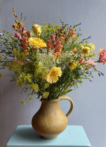 Die Sträuße von Ackerblüten aus Kürten sind wunderschön, farbenfroh und jede Woche ein bisschen anders - je nach dem, was gerade blüht. Alenas Blumen sind zwar nicht bio-zertifiziert, aber die Blumen werden nach den Richtlinien von Slowflower e.V. angebaut - das heißt:
