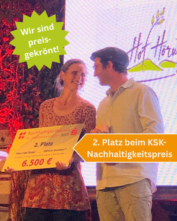 Anfang Juli waren wir bei der Preisverleihung des KSK-Nachhaltigkeits-preises und da gab es nicht nur lecker Schnittchen und Schampus, sondern wir wurden tatsächlich mit einen der begehrten Preise ausgezeichnet. Der KSK-Nachhaltigkeitspreis richtet sich an Vereine und Betriebe aller Branchen und Größen und zeichnet diese für ihr Engagement im Klimaschutz aus. Beworben haben wir uns mit unserem Agroforst-Projekt, wobei sich der nachhaltige Gedanke wie ein roter Faden durch all unsere Bereiche, von der Landwirtschaft bis zur Biokiste zieht. Gesunde Lebensmittel zu erzeugen und gleichzeitig einen Ort zu schaffen, an dem sich sowohl Tiere als auch Menschen wohlfühlen - das ist unser Ziel in allem, was wir tun. Das fand auch die fachkundige Jury ganz gut und zeichnete uns mit dem 2. Platz aus.